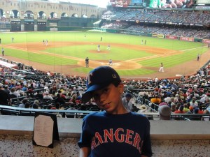 Yesterday we had the unique pleasure of attending a Houston Astro’s game.  One of Floyd’s patients has the most amazing box there right behind home plate and she graciously gave us seats to see our favorite baseball team play …Go Rangers!  And this being Jackson’s first major league game Floyd went all out and ordered us hats and t-shirts to aptly celebrate.   Floyd (the warrior as I like to call him) and Jackson (the ninja as he likes to be called) were excited for over a month to go cheer on their boys.  Me, I am not much of a sports fanatic.  I know the names because they say them constantly when giving each other the daily report.  This usually includes how many home runs Josh Hamilton hit or catches that Ian Kinsler made the night before.  I am content to be there watching the warrior and the ninja enjoy this beautiful gift of life and to take all of these experiences in.
